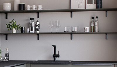 Petit espace, petit budget ? Nous avons la solution avec cette cuisine moderne aux tons gris et noirs. Optimisez chaque mètre carré sans faire de compromis sur les rangements grâce à son plan de travail slim, son grand casserolier, son meuble en coin et ses étagères murales. Tout cela sans oublier sa crédence assortie aux étagères qui vous permet de créer une belle continuité.
